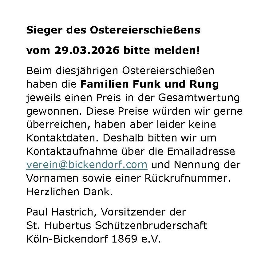 Im Jahre 1869 gründeten engagierte Männer die St. Hubertus Schützengesellschaft Köln-Bickendorf. Am 18.02.1928 wurde der Verein unter dem Namen St. Hubertus Schützenbruderschaft Köln-Bickendorf 1869 ins Vereinsregister beim Amtsgericht Köln eingetragen.